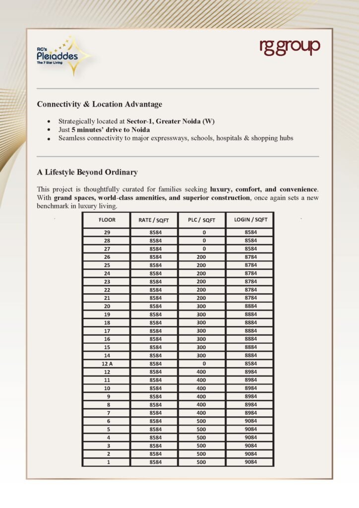 RG Pleiades in Sector 1, Greater Noida (Noida Extension) promises a luxurious and serene living experience in one of NCR’s fastest-developing regions, blending superior design, trusted development, and future-ready infrastructure.